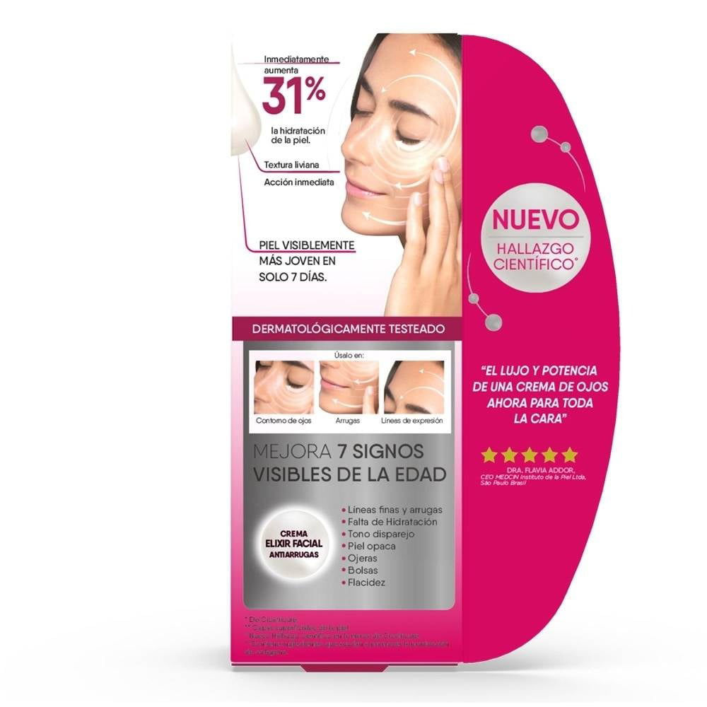 Este producto es una crema elixir facial anti-arrugas para el rostro y ojos, con una presentación de 30 gramos. Su textura es ligera y de rápida absorción.